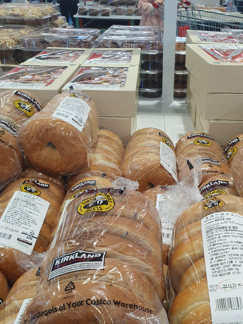 코스트코 베이글과 디너롤은 너도 나도 알만한 사람들은 다 안다는 가성비 좋은 유명한 인기상품입니다. 빵순이인 저도 정말 애정 하는 빵 중 하나인데요, *베이글은 플레인, 어니언, 블루베리 이렇게 3종류가 있고 한 줄에 6개가 들어있습니다. 1+1이고 교차구매가 가능해서 한 번에 원하는 맛으로 12개를 구매해올 수 있어요. 아무리 빵순이라고 해도 하루 이틀 만에 소진할 수 있는 양이 아니니 냉동 보관이 좋습니다. 그대로 냉동보관을 해도 무관하긴 했지만 반을 갈라 베이글을 2등분 해주고 등을 맞대어 포개 준 뒤 원래의 베이글 봉투에 넣어주면 꽝꽝 얼어도 들러붙지 않고 해동도 빠르며 여기저기 활용하기가 아주 좋습니다. 토스트기 넣을 때도 아주 좋더라고요!